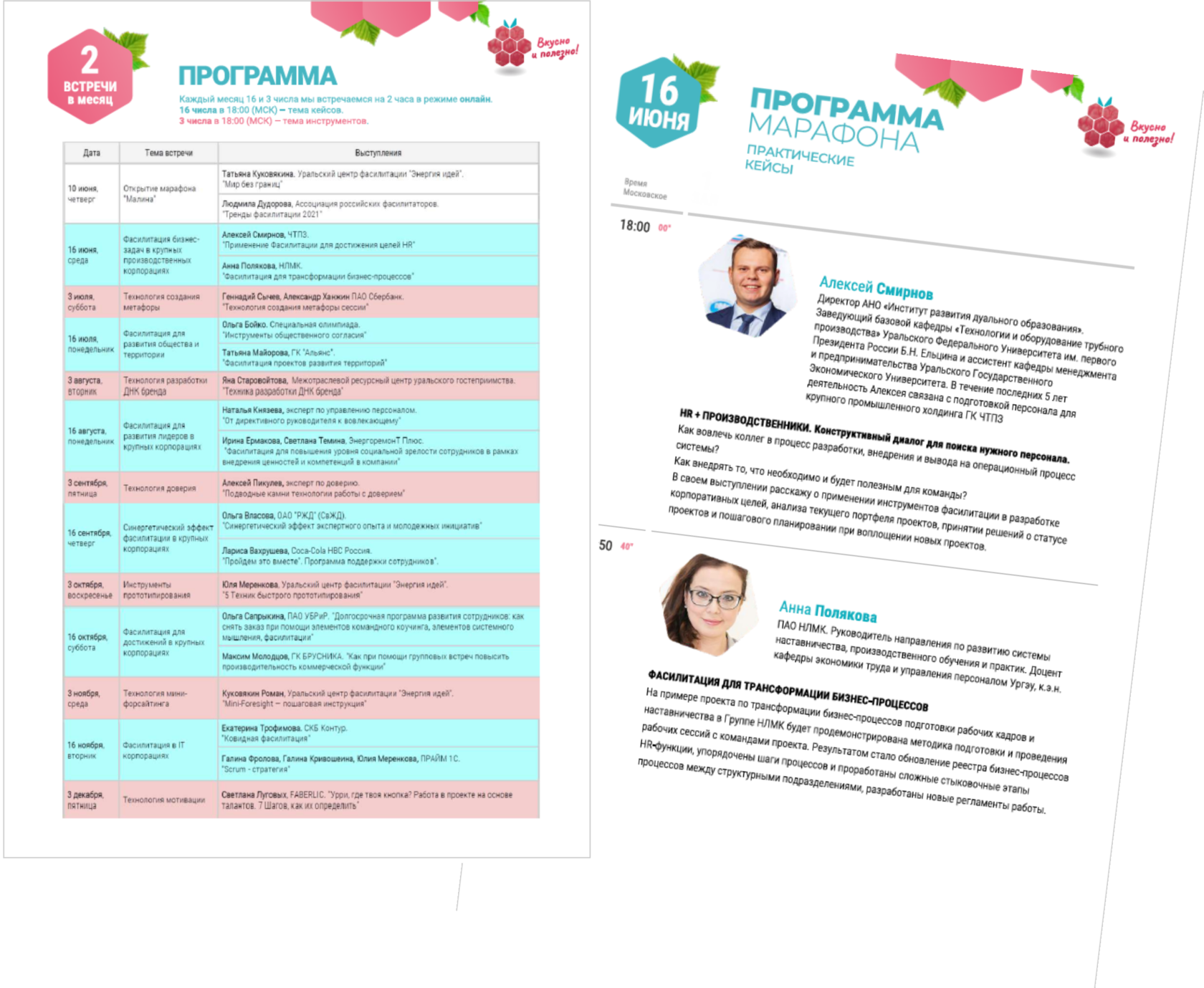 16 числа каждого месяца участников ждет знакомство с опытом применения фасилитации на основе 14 практических кейсов предприятий и организаций разных сфер деятельности — крупных игроков рынка.